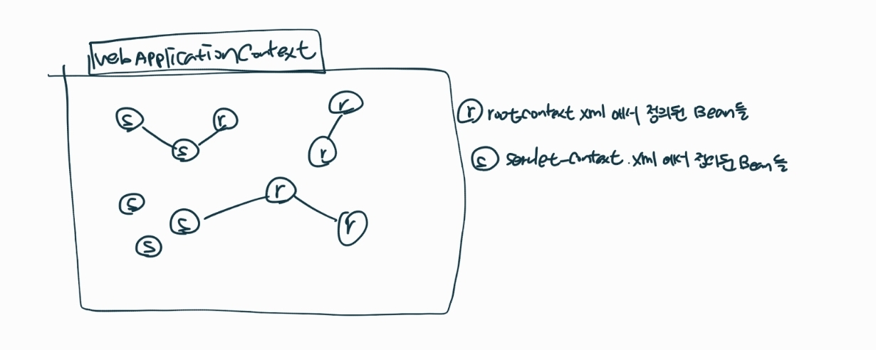 바깥쪽의 WebApplicationContext라는 구조는 기존의 구조에 MVC설정을 포함하는 구조로 만들어진다.