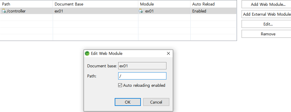 절대 경로를 이용하는 구조를 사용하기 위해 Tomcat의 Modules 메뉴를 이용해서 '/' 경로로 프로젝트가 실행 될수 있도록 아래와 같은 처리를 한다.