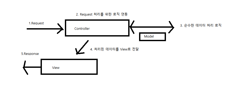 컨트롤러는 데이터를 처리하는 존재를 이용해서 데이터(Model)를 처리하고 Response 할 때 필요한 데이터(Model)를 View쪽으로 전달하게 된다.