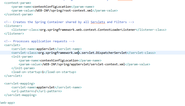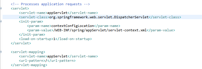1. 사용자의 Request는 Front-Controller인 DispatcherServlet을 통해 처리된다. 생성된 프로젝트의 web.xml을 보면 아래와 같이 모든 Request를 DispatcherServlet이 받도록 처리하고 있다.