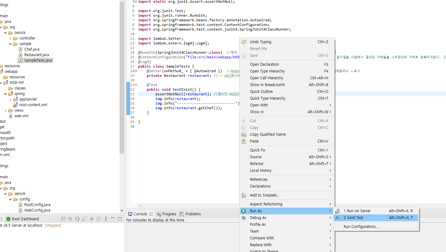 예제는 Lombok을 이용해서 setter메서드를 자동으로 구현되게 할것이므로 -> pom.xml에서 Lombok라이브러리추가 ,spring-test라이브러리 이용