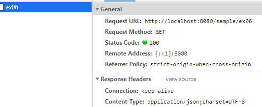개발자도구를 통해보면 서버에서 전송하는 MIME 타입이 'application/json' 으로 처리되는것을 볼 수있다.