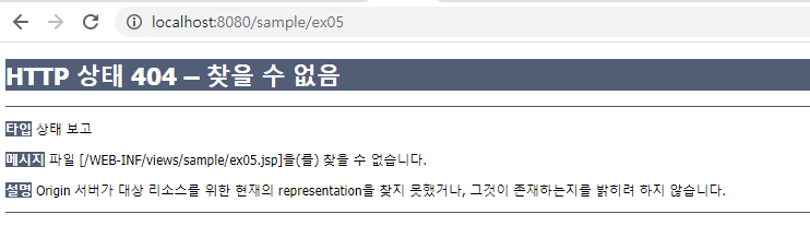 에러 메세지를 보면 원인이 'WEB-INF/views/sample/ex05.jsp'를 찾을 수 없어서 생기는 문제라는것을 볼 수있다.