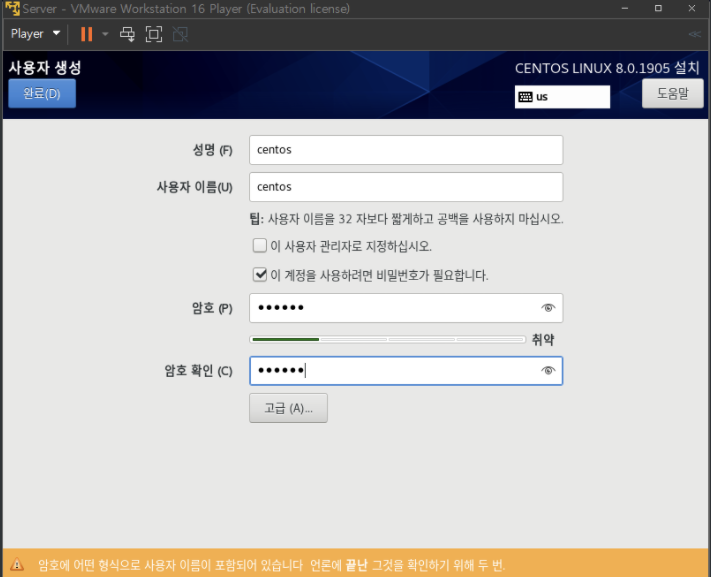 반드시 한명의 일반 사용자를 만들어주어야한다. 입력후 완료x2 눌러야한다.