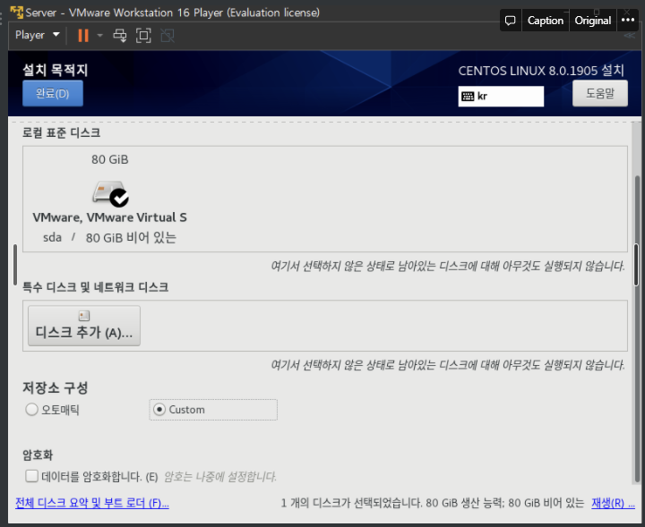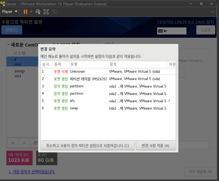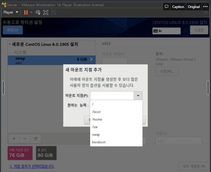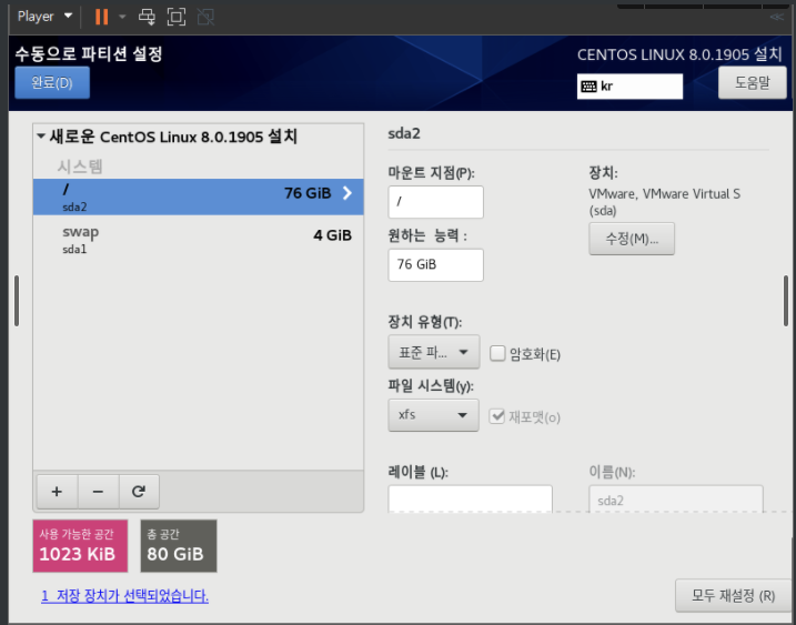 슬래시파티션 선택, 용량은 빈공간으로 둔다(80-swap한 나머지 용량 배정)