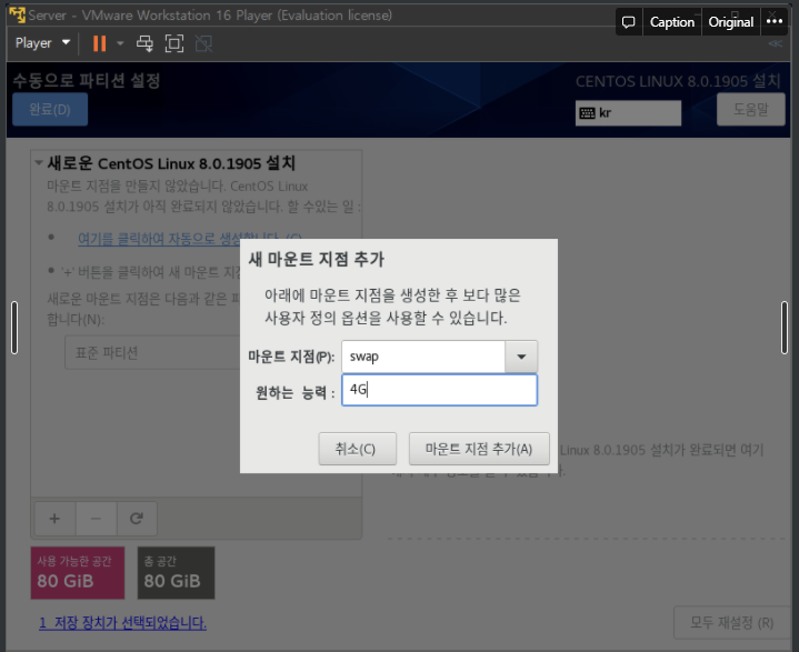 +눌러서 마운트지점, 용량 설정 (80기가중 4기가를 임시 메모리 공간으로 사용한다.)